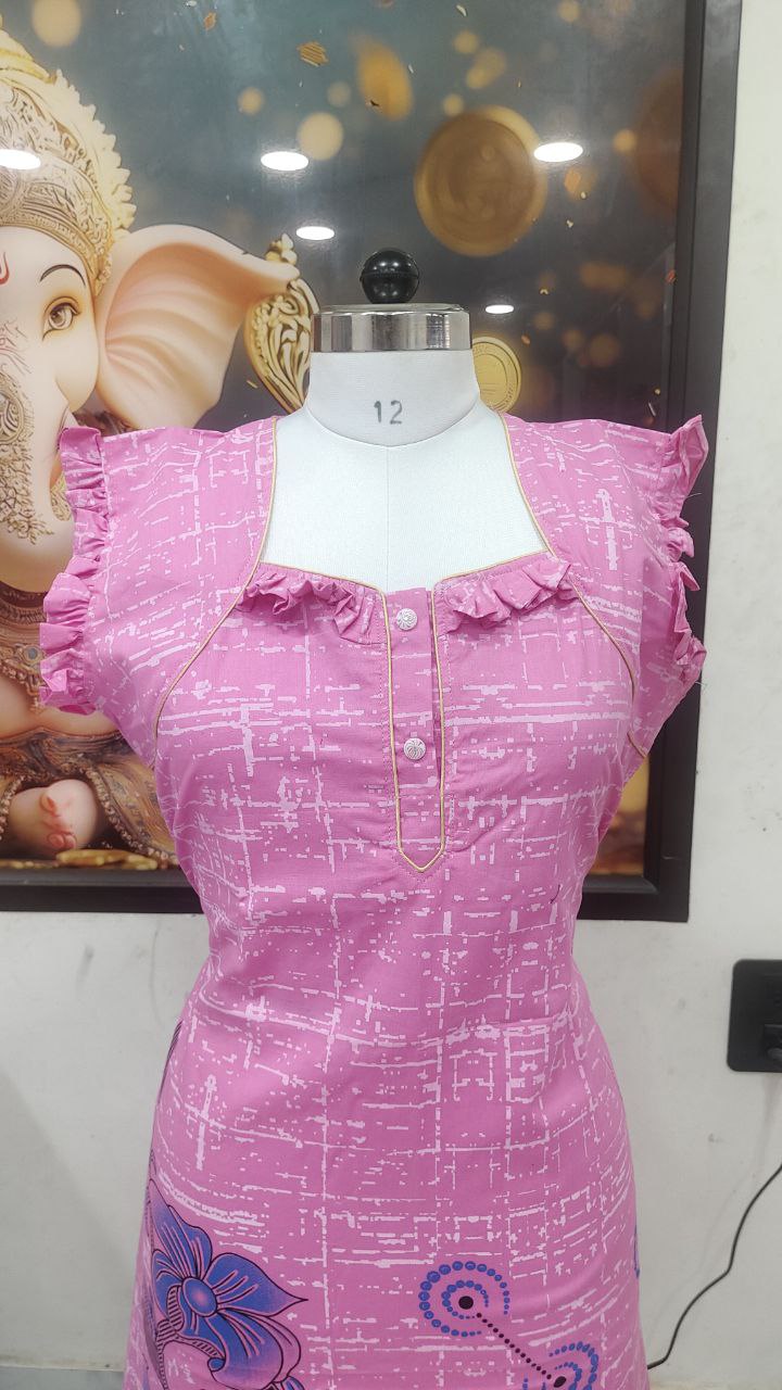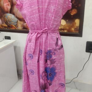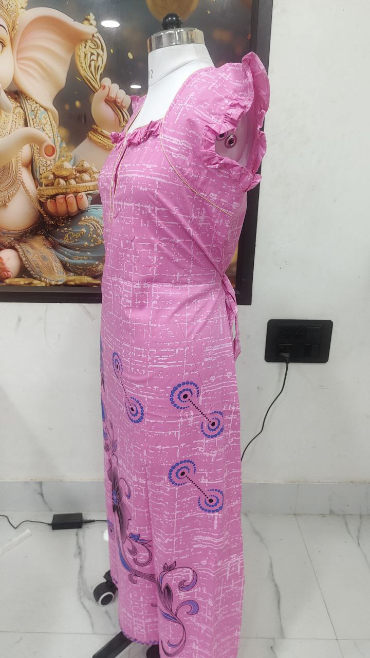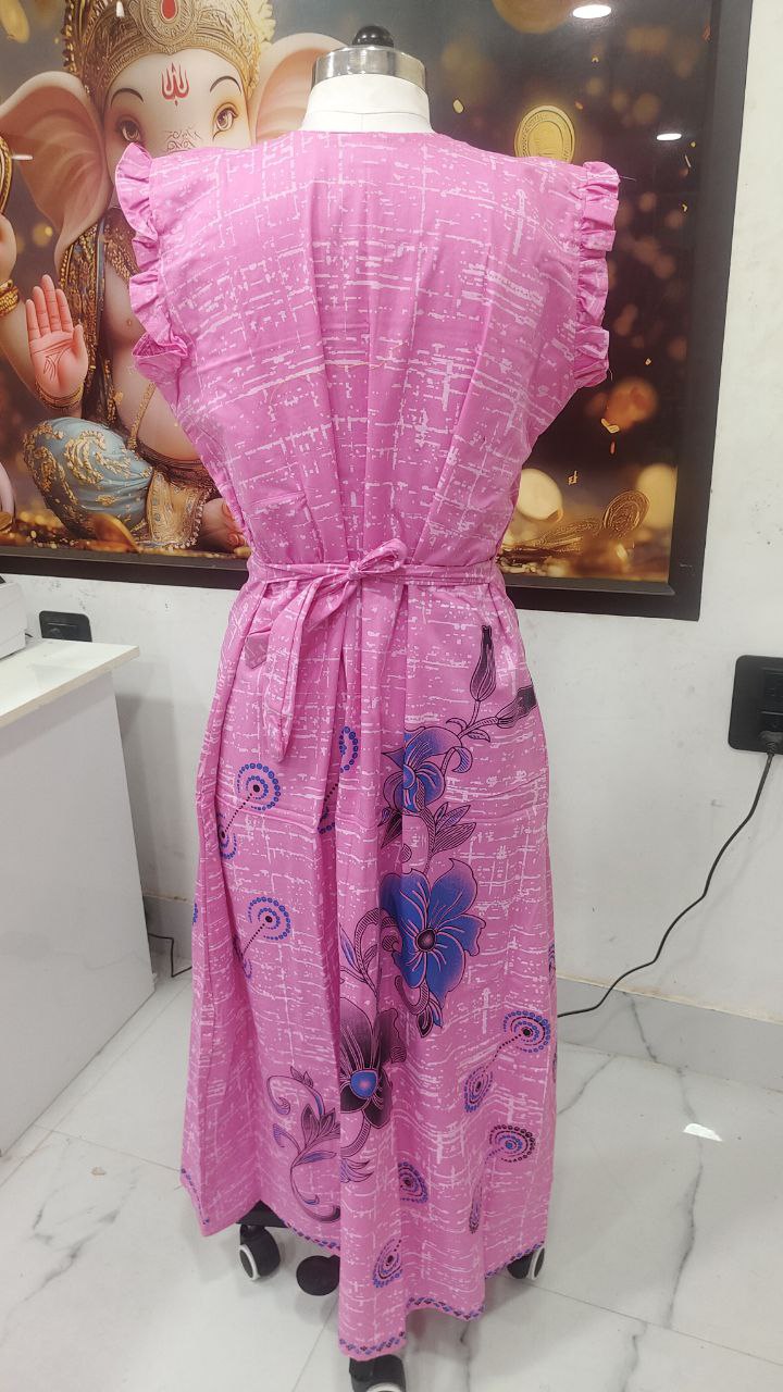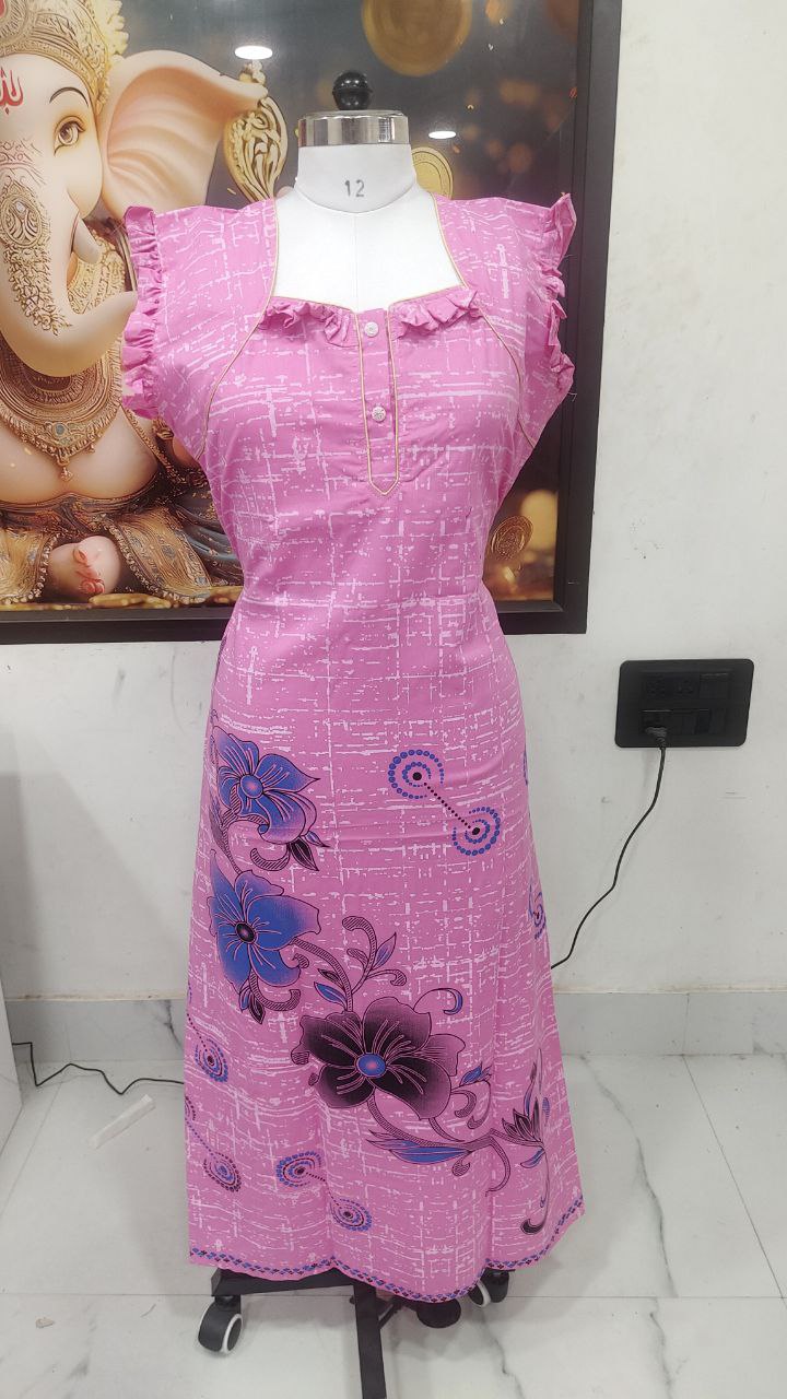 Stay cozy and stylish in this elegant Cotton Nighty in a vibrant pink color with blue floral prints. Tailored from soft, breathable cotton, it offers all-day comfort for lounging or sleeping. The frill cap sleeves and front buttons add a touch of charm to the classic design.