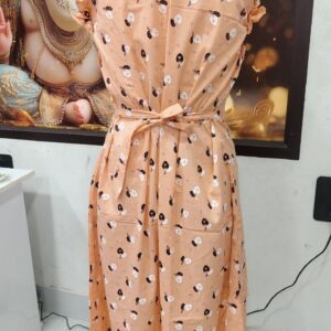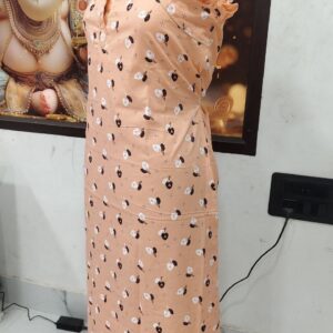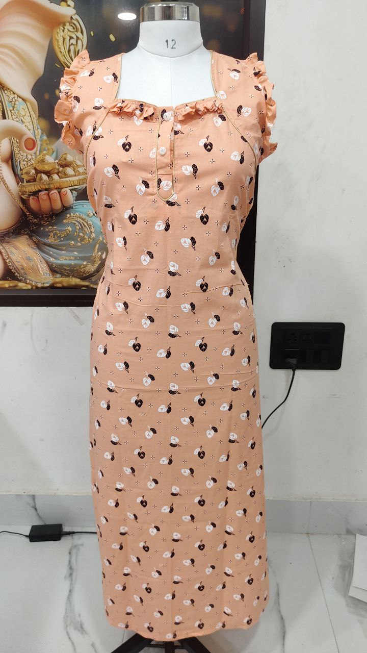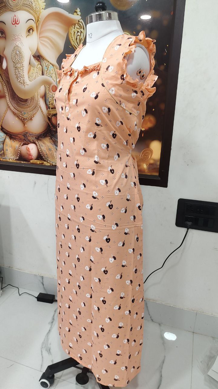 Stay cozy and stylish in this elegant Cotton Nighty in a vibrant pink color with blue floral prints. Tailored from soft, breathable cotton, it offers all-day comfort for lounging or sleeping. The frill cap sleeves and front buttons add a touch of charm to the classic design.
