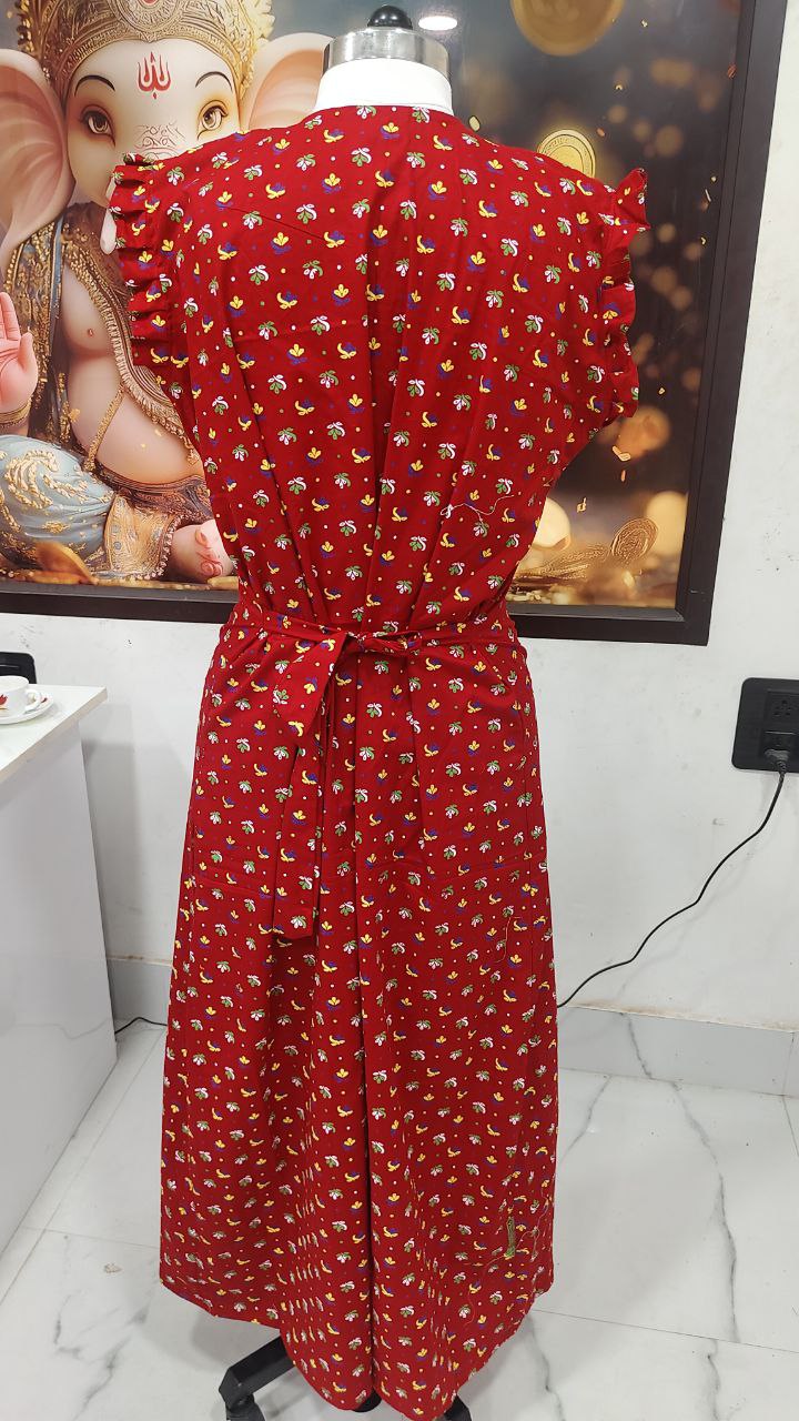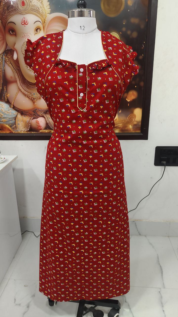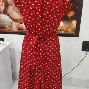 Stay cozy and stylish in this elegant Cotton Nighty in a vibrant pink color with blue floral prints. Tailored from soft, breathable cotton, it offers all-day comfort for lounging or sleeping. The frill cap sleeves and front buttons add a touch of charm to the classic design.