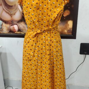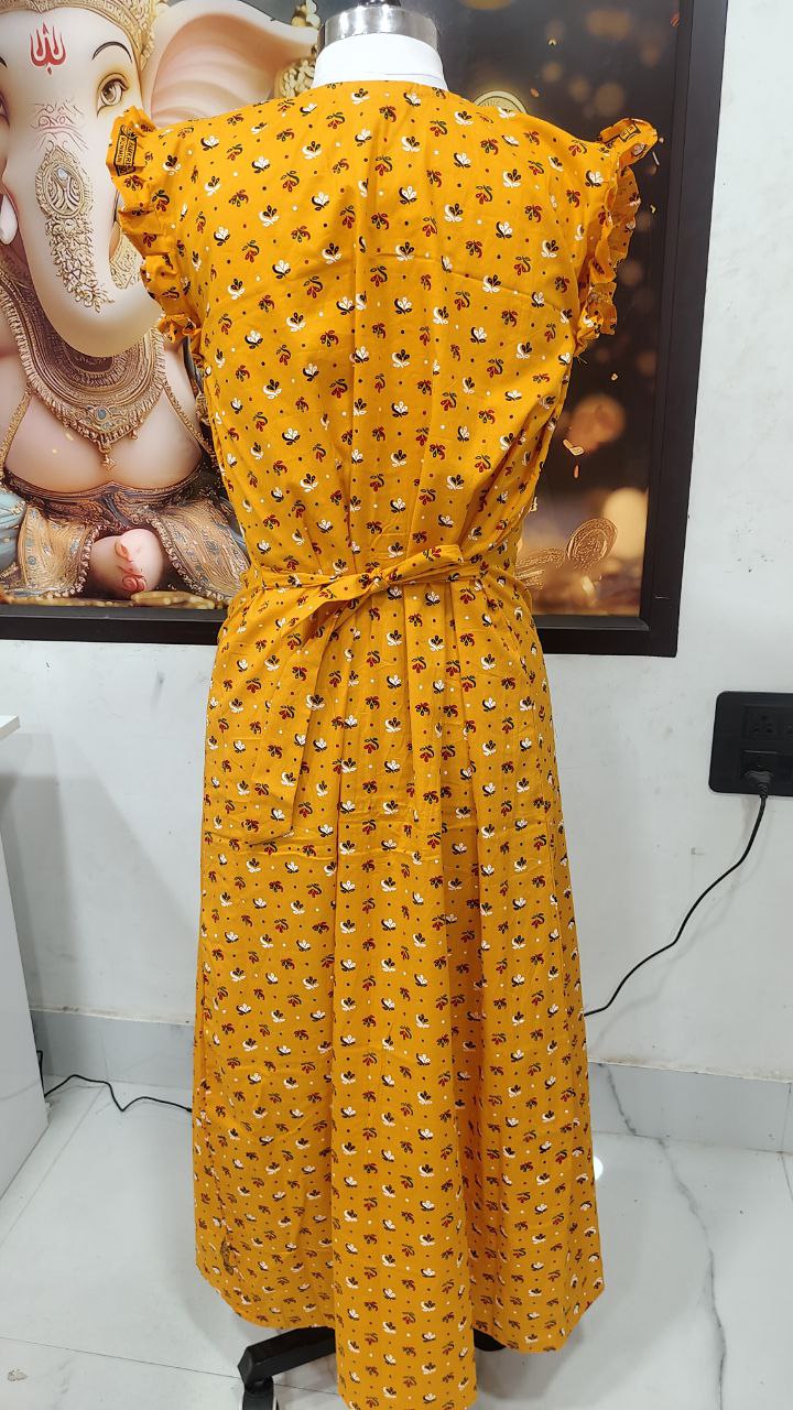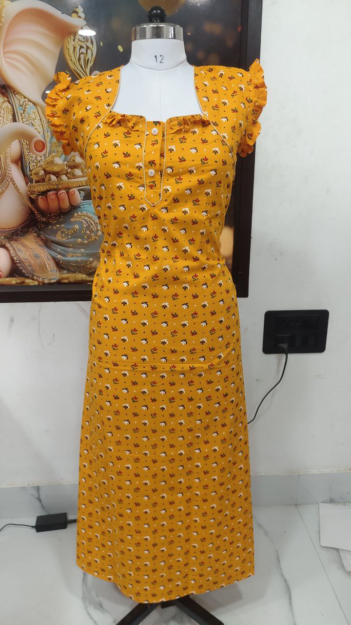 Stay cozy and stylish in this elegant Cotton Nighty in a vibrant pink color with blue floral prints. Tailored from soft, breathable cotton, it offers all-day comfort for lounging or sleeping. The frill cap sleeves and front buttons add a touch of charm to the classic design.